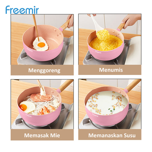 Freemir Panci 18 cm Panci Rebus Mpasi Pink dengan Tutup Kaca Tebal Anti Lengket Granit BPA Free PFOA Free Peralatan Dapur Minimalis Gagang Kayu Anti Panas