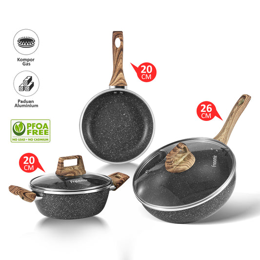 Freemir 3 in 1 set Wajan Penggorengan 26-20-20 cm Anti Lengket dengan Tutup Kaca Tebal Granit BPA Free PFOA Free Peralatan Dapur Minimalis Gagang Kayu Anti Panas
